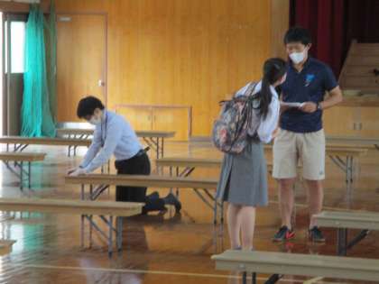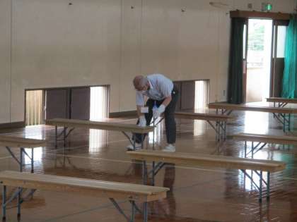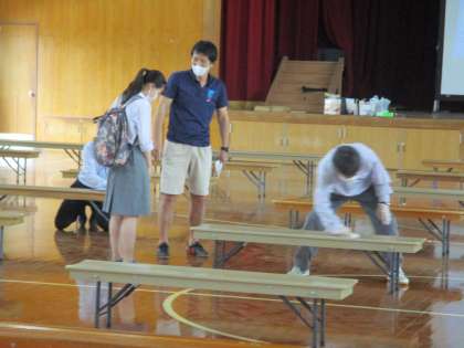 講堂は次に2年が使うので,使った長椅子はアルコールで拭いています。