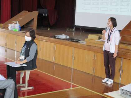 学年主任はペットボトルで作った透明マスクを使って話をしています。彼女の前に5組の生徒が居るので,口元が見えるようにしています。