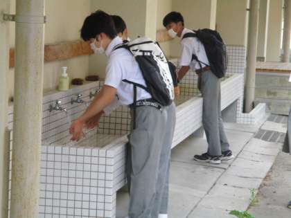 教室に入る前に,せっけんを使ってしっかりと手洗いを行います。