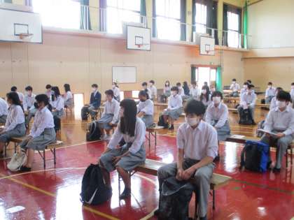 手洗いを済ませた人から講堂に集合し,健康観察表など,提出物の用意をして始まるのを待ちました。