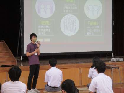 若い2人の先生が,感染予防と差別や偏見をなくすための話をしました。