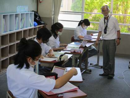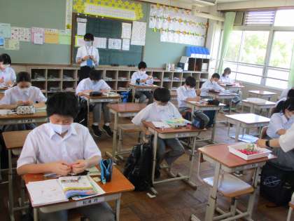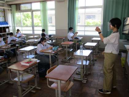 5組の授業では口元が見えるようにと,教師はフェイス・シールドを装着して授業をします。ほかの学級でもそのようにして授業をしている教師は少なくありません。