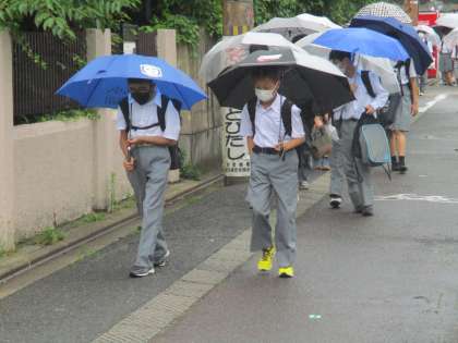 体育館工事のため,グランドに設けられた仮設の渡り廊下を通って移動しますが,屋根がありません。
