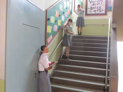 5時間目が美術か音楽なのでしょう,3年生が早めに来て階段で「パ・イ・ナ・ッ・プ・ル」とやっていました。