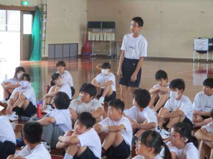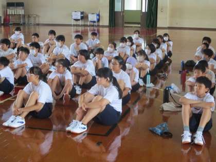 1年は体育です。全体で陸上競技(走り幅跳び・ハードル走・走り高跳び)のVTRを観て分かったこと,感じたことを出し合っていました。