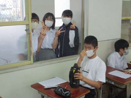 グランドが使えないので,各教室前の廊下に集まっています。