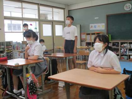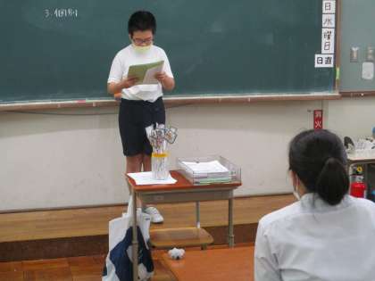 6組では,生徒総会の後半に発表する学級目標の紹介を練習していました。