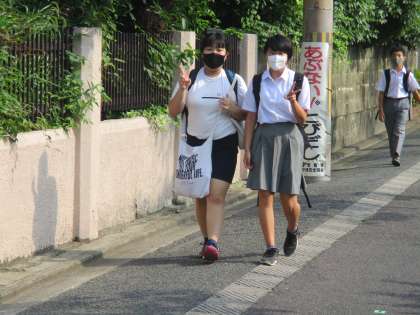 これくらいの暑さには負けない二条中の子たちが,今日も元気に登校してきました。