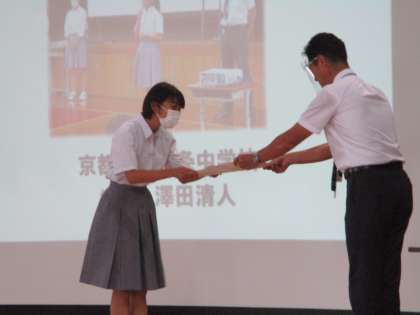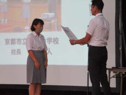 陸上競技の砲丸投げと200m走で入賞した2年生,そして,昨日まで行われていた文部科学大臣杯で優勝を果たした野球部に対して,学校長から表彰状を渡しました。
