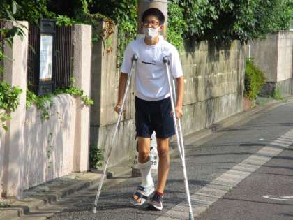部活動の試合で負傷したそうです。気の毒に…!不自由でしょうが,しばらく辛抱してください。若いので治りも早いと思います。頑張って!