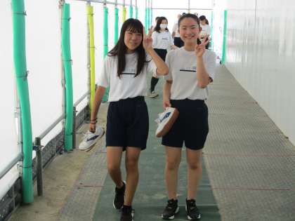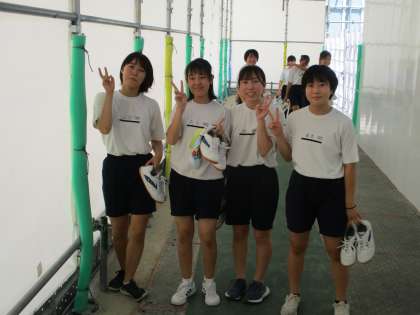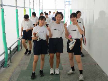 女子がやっている講堂へ上がろうとしたところ,授業を終えて教室へ戻ってきました。たっぷり汗をかいたので,着替えに時間がかかると思って早目に授業を終えたのでしょう。