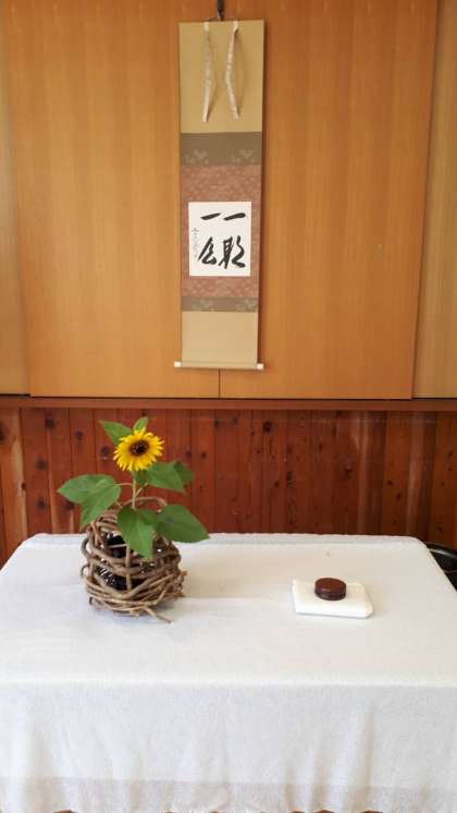 今日の午前中,作動体験学習をしました。今回から新規募集の人も参加してくれました。お軸は兵庫県但馬地方にある極楽寺のご住職,西垣大道師の「一期一会」,お香合はミ村瀬治兵衛の工房,嘉門のものできんまです。花入れは,指導の高橋先生ご自昨の籠花入れに学校の向日葵一輪を入れました。お菓子は,亀廣脇さんの着せ綿(主菓子),干菓子は求肥でこぼれ萩を丸久小山園のお茶とともにおいしくいただきました。