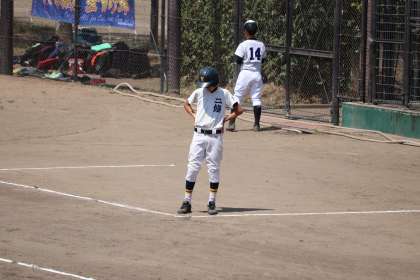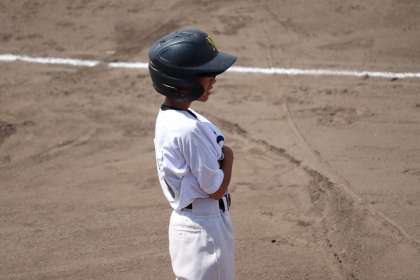 ライト・細谷君(2年生),1塁側ランナーコーチ・皐君(2年生),3塁側ランナーコーチ・山根君(2年生)