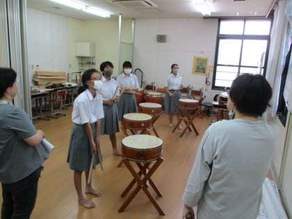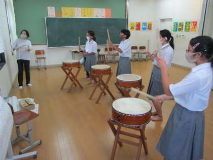 音楽の時間に和太鼓の練習をしていました。1年生は初めてなのでなかなか大変です。