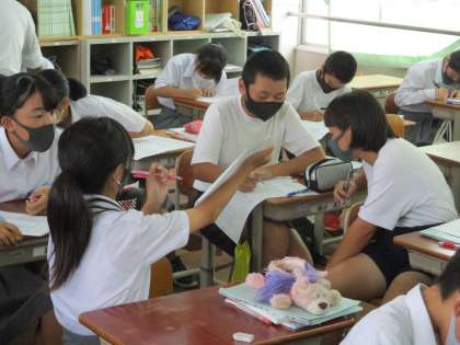 2年からはまず1組の数学の様子です。問題を解く過程で「教え合い」を取り入れているようです。