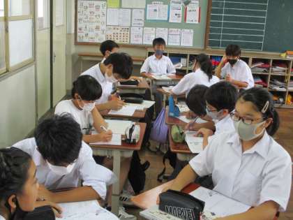 5組の生徒が交流学級で一緒に学んいるので,5組の担任の先生が各教室を見て回っています。