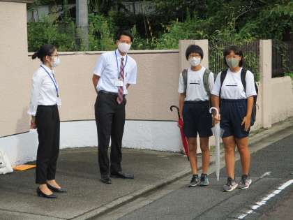 教育実習生が生徒の名前をを呼びながら挨拶をしていました。