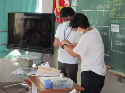 1組は理科です。T2の先生に手伝ってもらって実験の準備です。