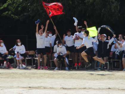 生徒会長が旗をもって応援席の前を走ります。ウェーブを起こすのが目的です。