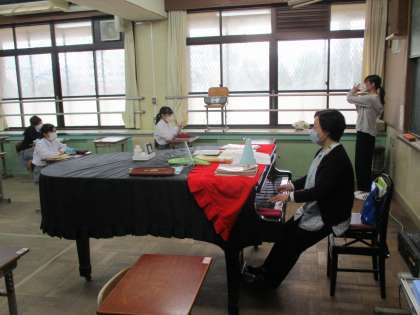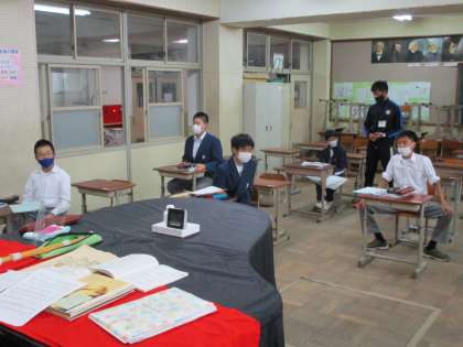 音楽の時間,私が訪れた時には「二条中学校校歌」の練習でした。