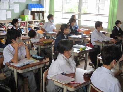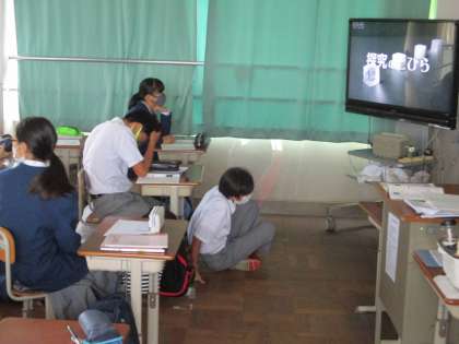 1組は理科です。個体を温めるとどうなるかの実験ですが,1000度以上にすることは理科室ではできません。そこで,VTRを観ています。