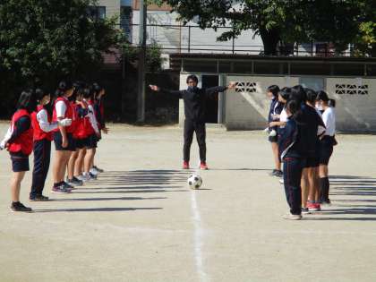 女子はグランドでサッカーです。