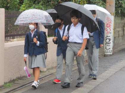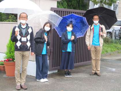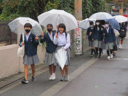 今日は月初で,PTA本部役員の皆様が校門に立って挨拶に加わってくださいました。雨の中をどうも有難うございました。