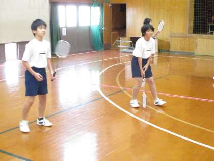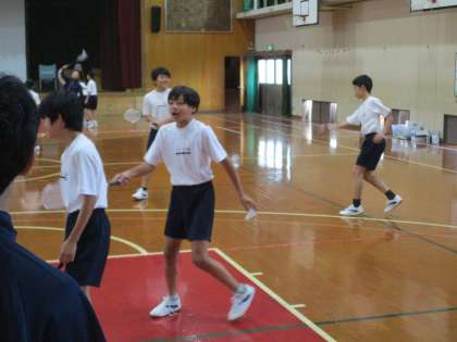 1年1・2組は体育です。男子は講堂でバドミントンを楽しんでいました。