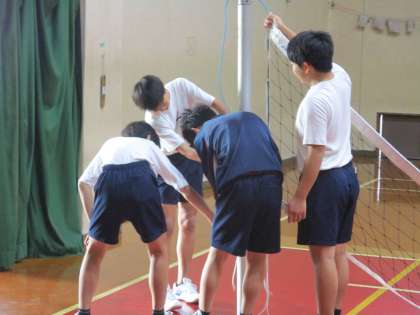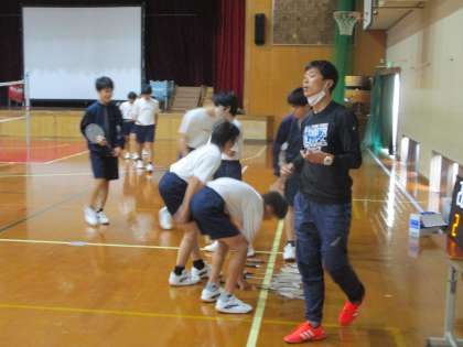 1・2組が体育です。男子は講堂でバドミントンです。徐々に上手になってきています。