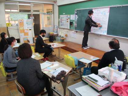 今回は二条城北小の先生方が研究授業をされ,正親小と二条中の教職員が参観をし,その後,協議会をもつという形式でした。