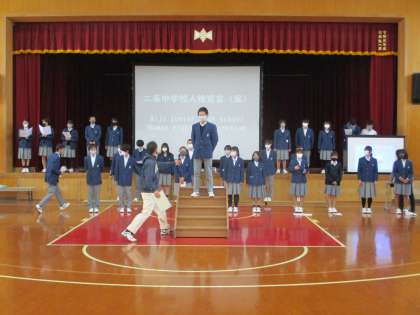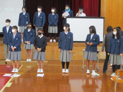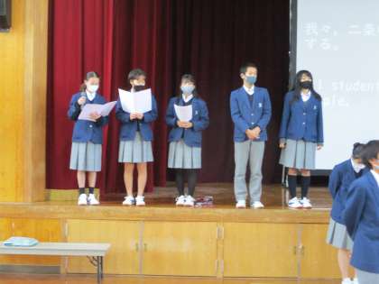 カナリー委員会が中心となって作成した「二条中人権宣言」を学習発表会で発表します。練習が最終段階になっており,今日は本番同様,講堂で練習を行いました。