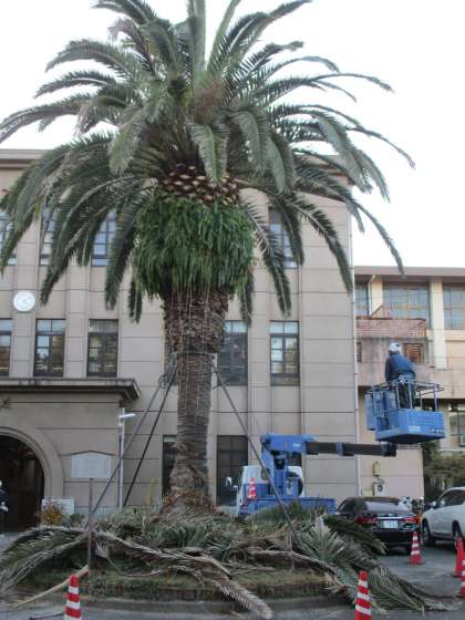 1年に1度,カナリーヤシが散髪をしてもらいます。