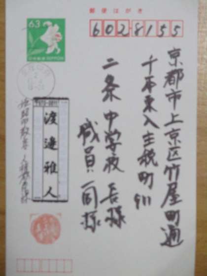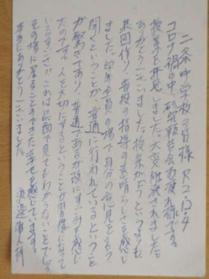 金曜日の公開授業を見に来て頂いた,姫路市の教育委員会で指導主事をされている方からお葉書をいただきました。ご本人に了解を得ましたので以下に紹介させていただきます。