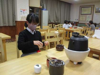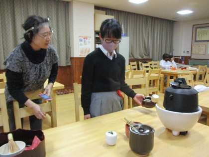 午後からの部活動に行かなければならない人は少し早く帰ったそうですが,昼過ぎまでお稽古していました。私もおいしいお菓子とお点前を頂きました。