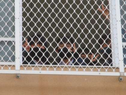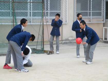 上の方から声がするので見上げると,南校舎3階の廊下の窓から手を振っている人たちがいました。グランドからだと誰だかあまり分かりませんが…。