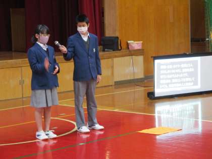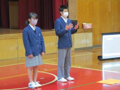 はじめ,手話だけで伝えていました。会場が水を打ったように静かになり,生徒の視線が5組の2人の生徒に傾注されているのがよく分かりました。『さすが二条中の生徒たち!』本当にそう思いました。