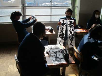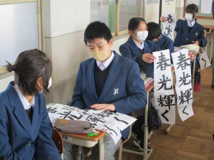 1組の国語では書道の書初め展に出品する作品を選んでいるところです。友達の意見も聞いて決めるよう先生から指示が出されました。