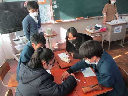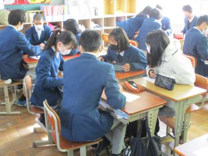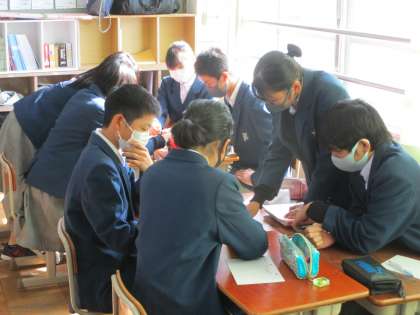 文章がハサミでバラバラにカットしてあります。それらをつないで一つの文章にしてそれを先生の所へ持っていくと,正しければ答えてもらえます。その答えをワークシートに書くというワークです。ただし,会話の場面とワークに書き込む場面では主語が違ってくるので要注意です。