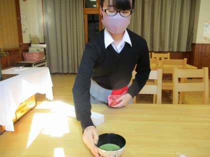 お菓子も別のものを頂き,今度は2年生が点ててくれたお茶もお替りを頂きました。お菓子等の説明は,後ほど先生からの情報を待ってそ紹介します。