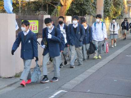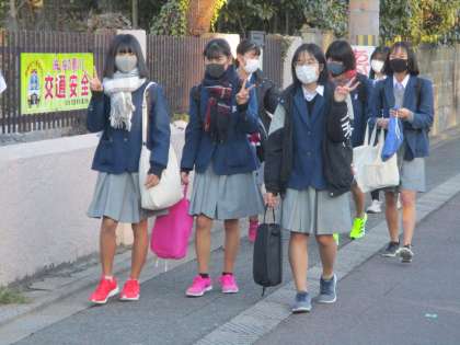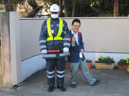 K君,今朝もガードマンさんと一緒に写真を撮るため全力疾走で登校してきました。