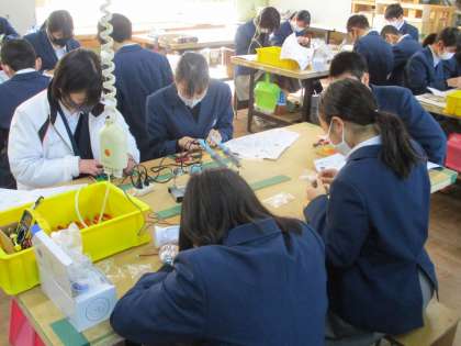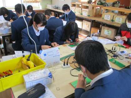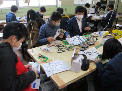 3組の技術。こちらは非常時に使うブザー付懐中電灯です。完成させた人もいました。