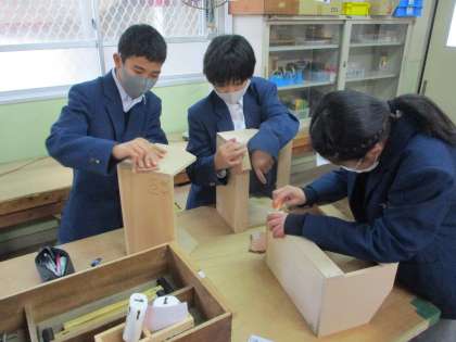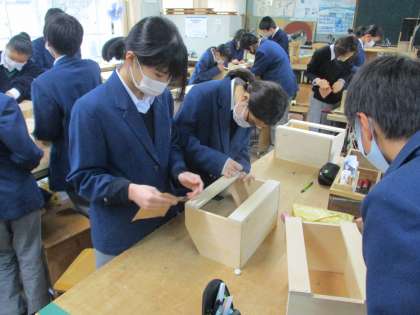 1組は技術です。このクラスでも本箱が完成に近づいてきました。