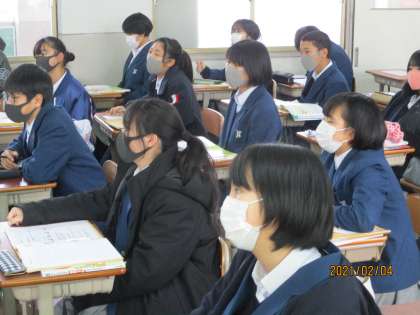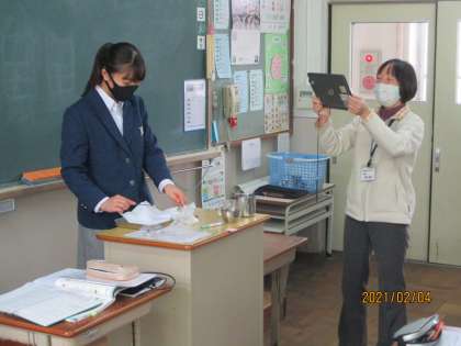 計量スプーンの使い方の実習です。先生がカメラで撮影して大型TVのスクリーンに実演している生徒の手元が大写しになっています。