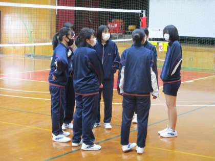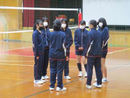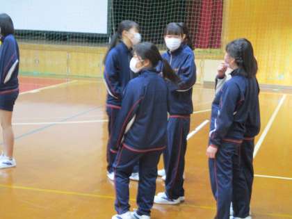 女子のバレーボールが始まる時の様子です。2組の女子が何やら話し合っています。