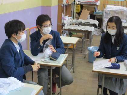 このクラスでは,ようやくTシャツの絞りが完成しました。次の時間に染めるようです。
