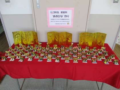 3月3日のひな祭りに合わせて大豆でお雛様を作成しました。出来上がった作品が南校舎の入り口に展示されています。よく見ると,少しずつ工夫が凝らされています。