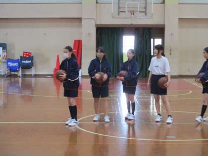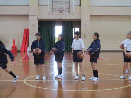 女子は講堂でバスケットボールです。