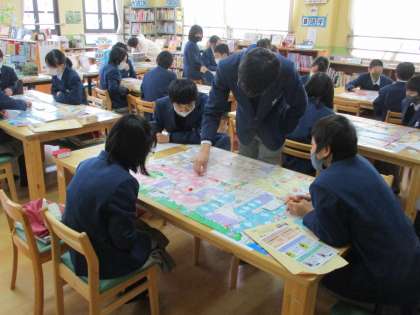 図書室のテーブルがやりやすいようですね。すごろくの中身ですが,なかなかうまく考えられていて,自然とごみの問題について考えられるようになっています。