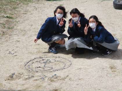 呼ばれていくと,グランドの石を並べてドラえもんが描かれてありました。
