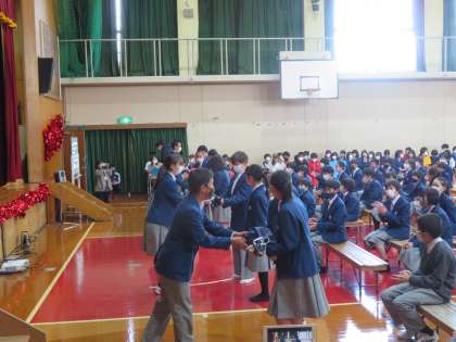 本日の3,4限に新入生歓迎会が行われました。生徒会本部生徒によるオープニングで盛り上がり,その楽しい雰囲気のまま学校紹介や部活紹介が披露されました。1年生にとって,更に二条中学校のことを知れる良い時間となりました。